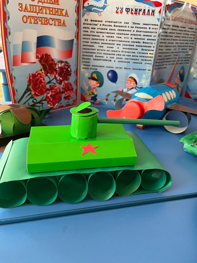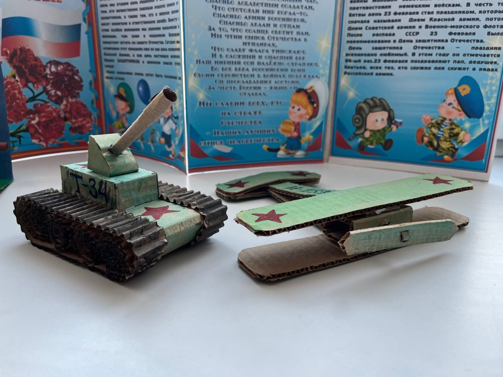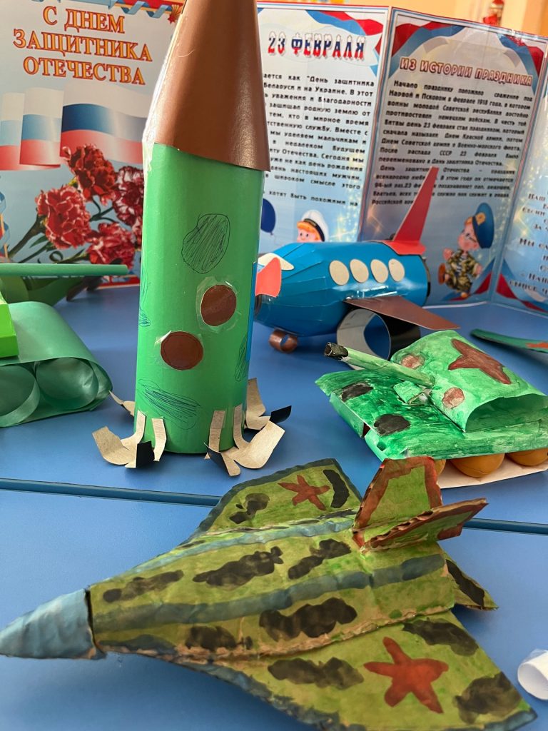 На выставке работ, представлены военные самолеты, танки, макеты с разной военной техникой и оружия. Все работы интересные, привлекательные, дети с огромным интересом посещают данную выставку и знакомятся в военной техникой. Особая роль выставки – это воспитание уважения к защитникам Отечества и чувства гордости за свою страну.