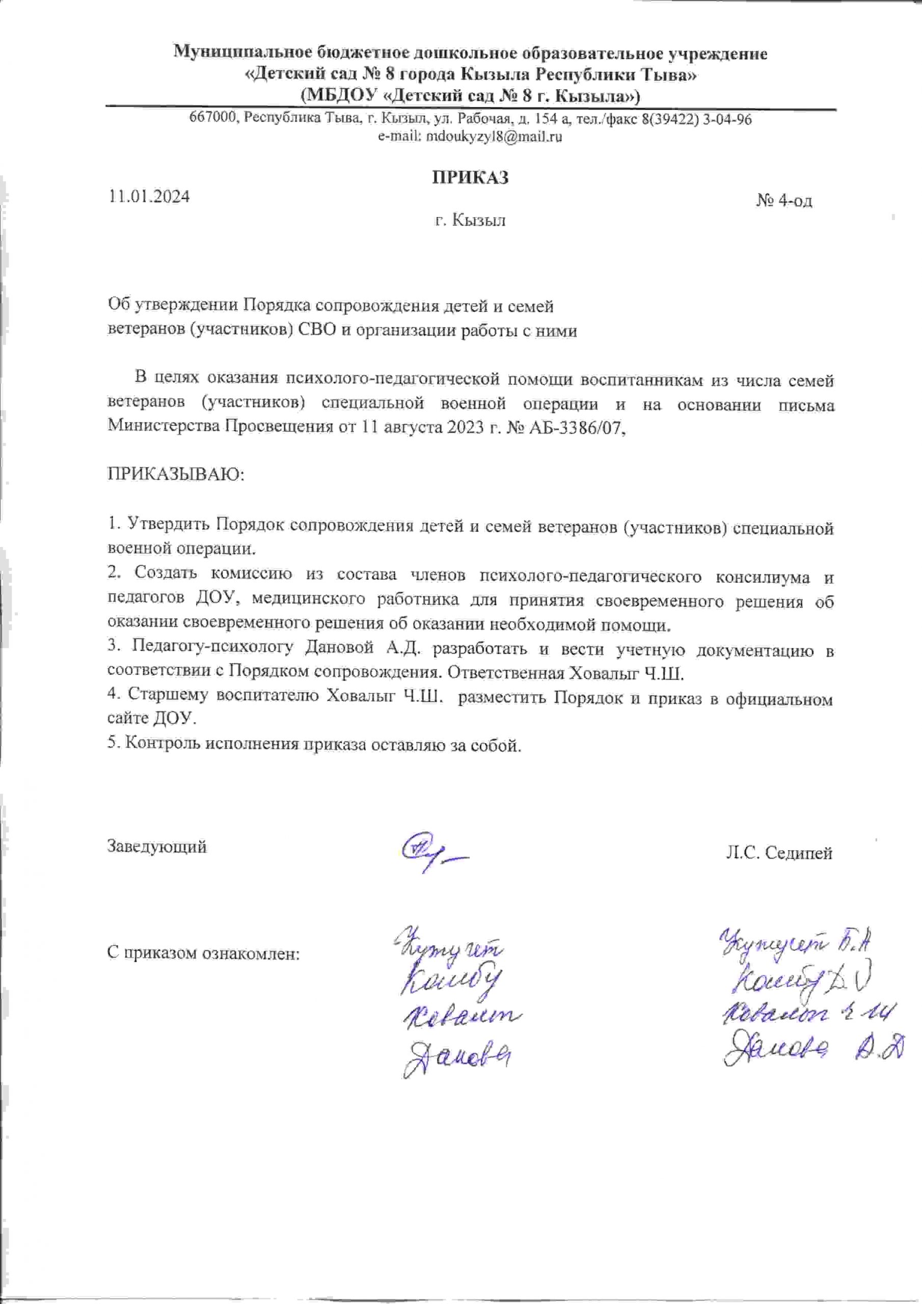 Приказ и Порядок работы МБДОУ \»Детский сад № 8 г. Кызыла\» в дистанционном режиме